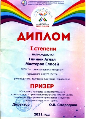 Педагоги Надежда Юрьевна Гончарова и Любовь Юрьевна Гончарова участвовали в районной выставке-конкурсе искусства бисероплетения «Фейерверк бисера». Номинация: «Творчество педагога». Конкурс проводился Центром детского и юношеского творчества «Ровесник» Истринского муниципального района. Надежда Юрьевна заняла I место, а Любовь Юрьевна - II место. Поздравляем! |