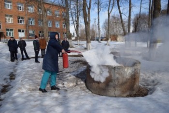 В процессе занятия проведен инструктаж персонала по вопросам обеспечения пожарной безопасности и отработано практическое применение первичных средств пожаротушения (огнетушителей), организовано тушение возможного очага пожара с использованием внутренней системы пожаротушения (ПК) с развертыванием пожарного рукава.