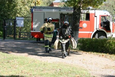 И тут, неожиданно, на школьную территорию въезжают пожарные машины. Одна, вторая, третья. Пожарные быстро разворачивают пожарные рукава, надевают защитные маски и бегут тушить спальный корпус, где по легенде произошло возгорание. Минута, пять, десять. Уставшие, но справившиеся с условным возгоранием, они выходят на улицу.